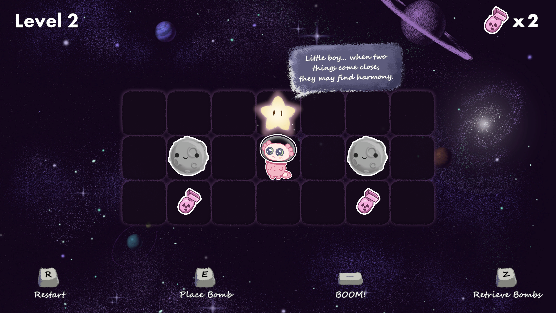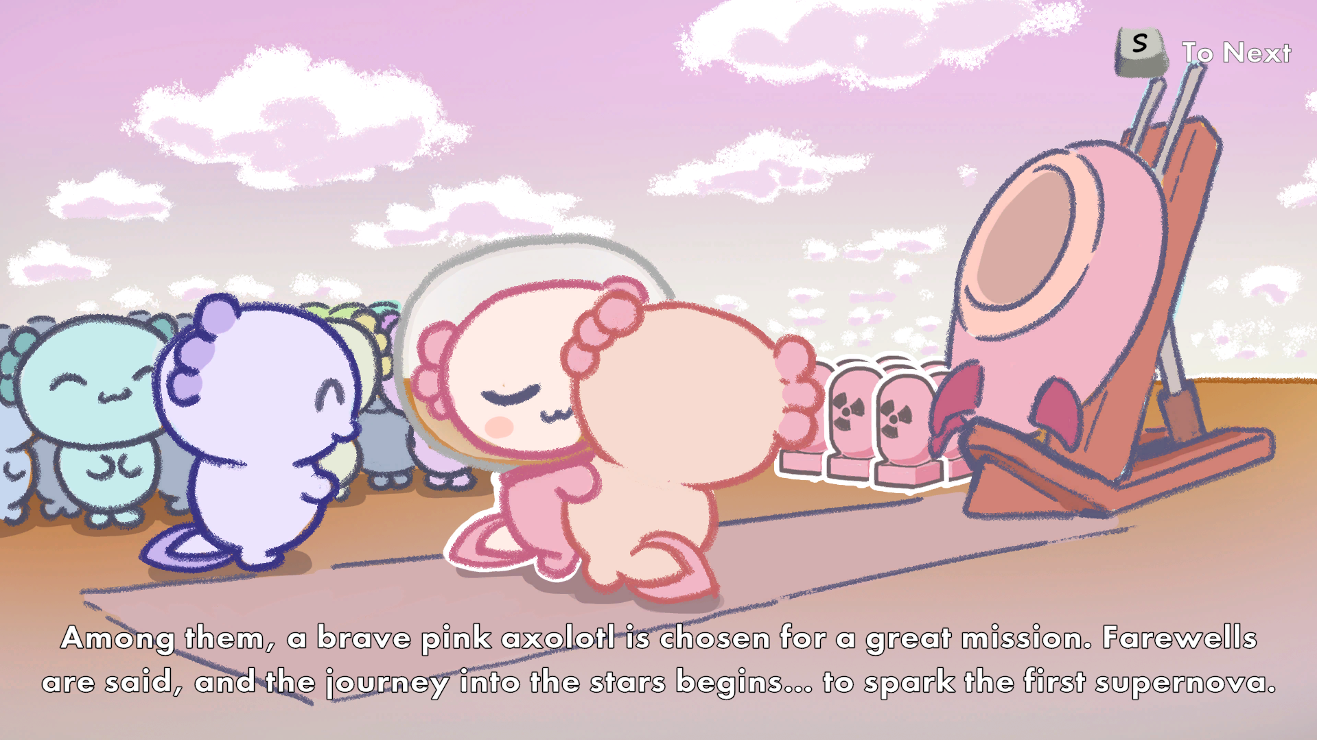 This is a 2D sokoban-style puzzle game where you take on the role of a brave axolotl from the distant Axolotl Planet. As your homeworld slowly withers away, you are entrusted with a monumental mission: to venture into the vast universe, triggering a chain of supernova explosions in a desperate effort to forge a new planet rich with resources to ensure the survival of your species.