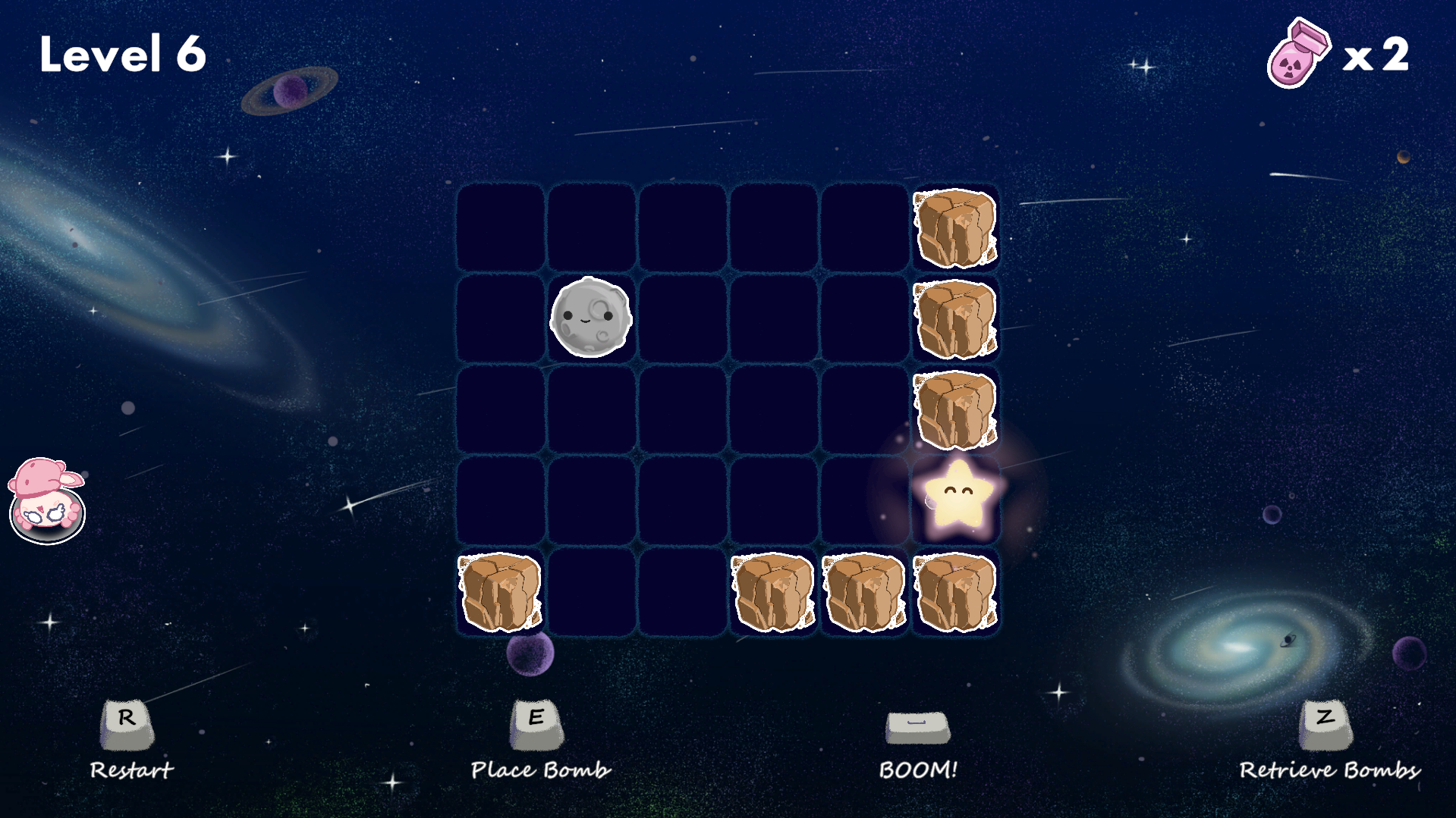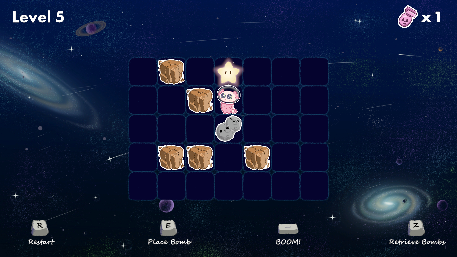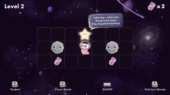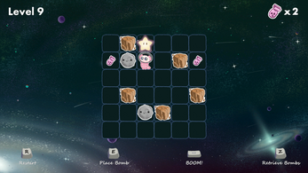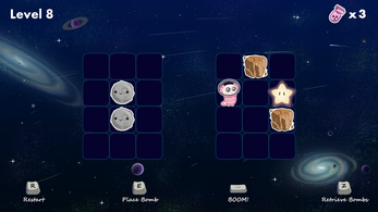 Hey, very cool take on Sokoban! The animation and art style are super cute, I love it. The learning curve feels great too. Just a small opinion, but using the Z key to retrieve the bomb feels a bit awkward since my hand is usually positioned to press E and Space. I have to stretch down to hit Z, so maybe Q would be a more comfortable key for retrieving the bomb, though that might just be me lol. Anyway, congrats on making such a polished game in just 7 days!